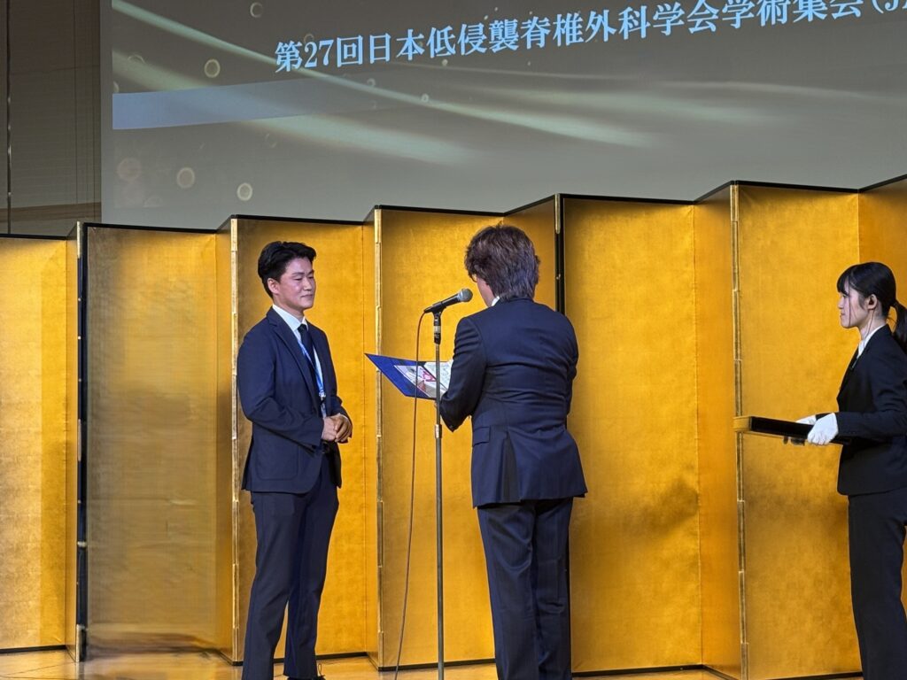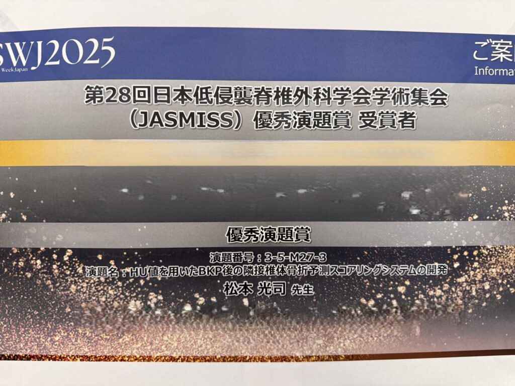 第28回日本低侵襲脊椎外科学会学術集会で、松本光司先生の『HU値を用いたBKP後の隣接椎体骨折予測スコアリングシステムの開発』が優秀演題賞に選ばれました!