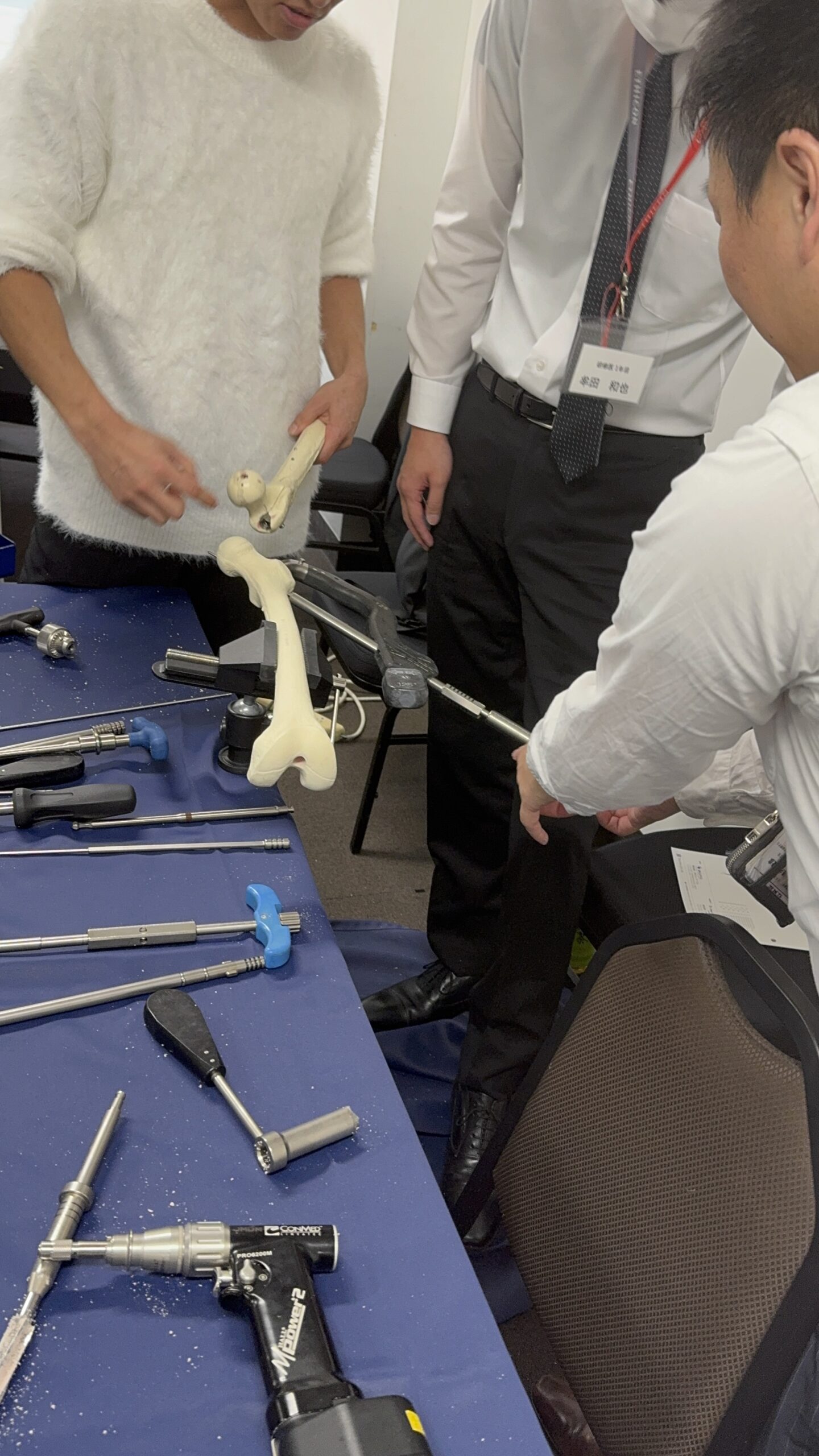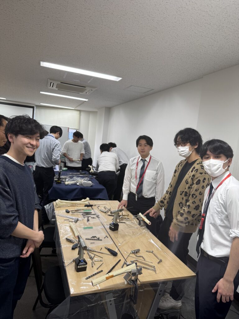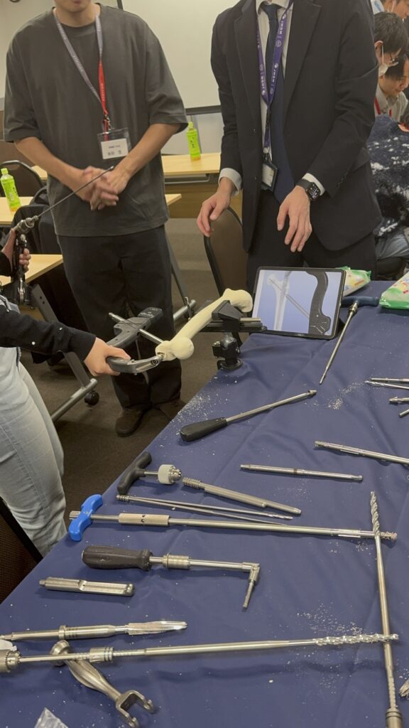 若手整形外科医の先生たちが6つのブースに分かれ、電気メスの使い方、脊椎や骨折、スポーツ整形に必須の関節鏡の基本手技などについて、丁寧に教えてもらいながら体験してもらいました。